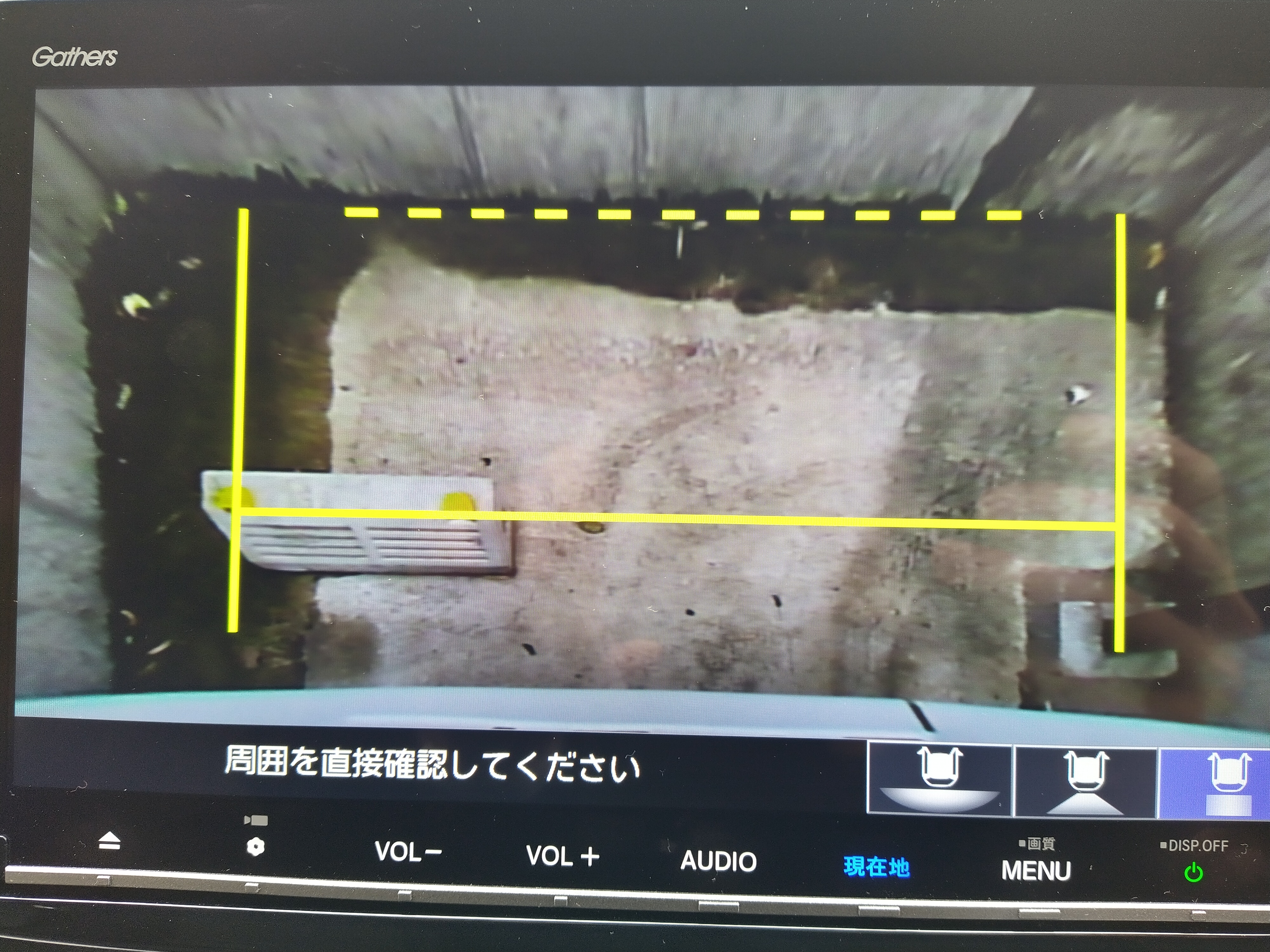 STEP WGN にはリアカメラも付けました。買い替え前もついていましたが、微妙に見え方が違う気がします。カメラ映像も、ワイドビュー、ノーマルビュー、トップダウンビューと3種類あり、見え方が異なります。
